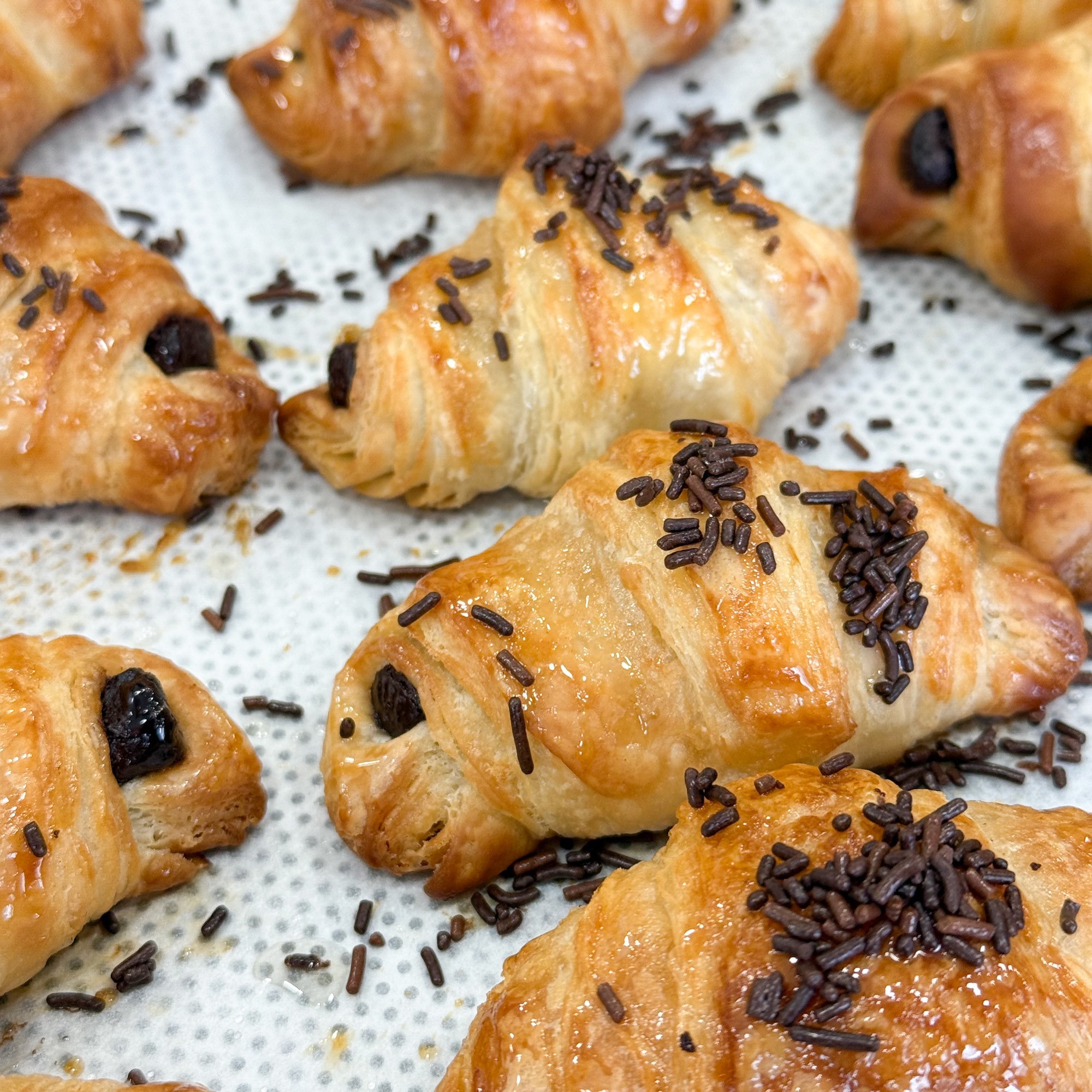 Artesanito relleno de chocolate con avellanas, crujiente y dorado por fuera, tierno y suave por dentro.