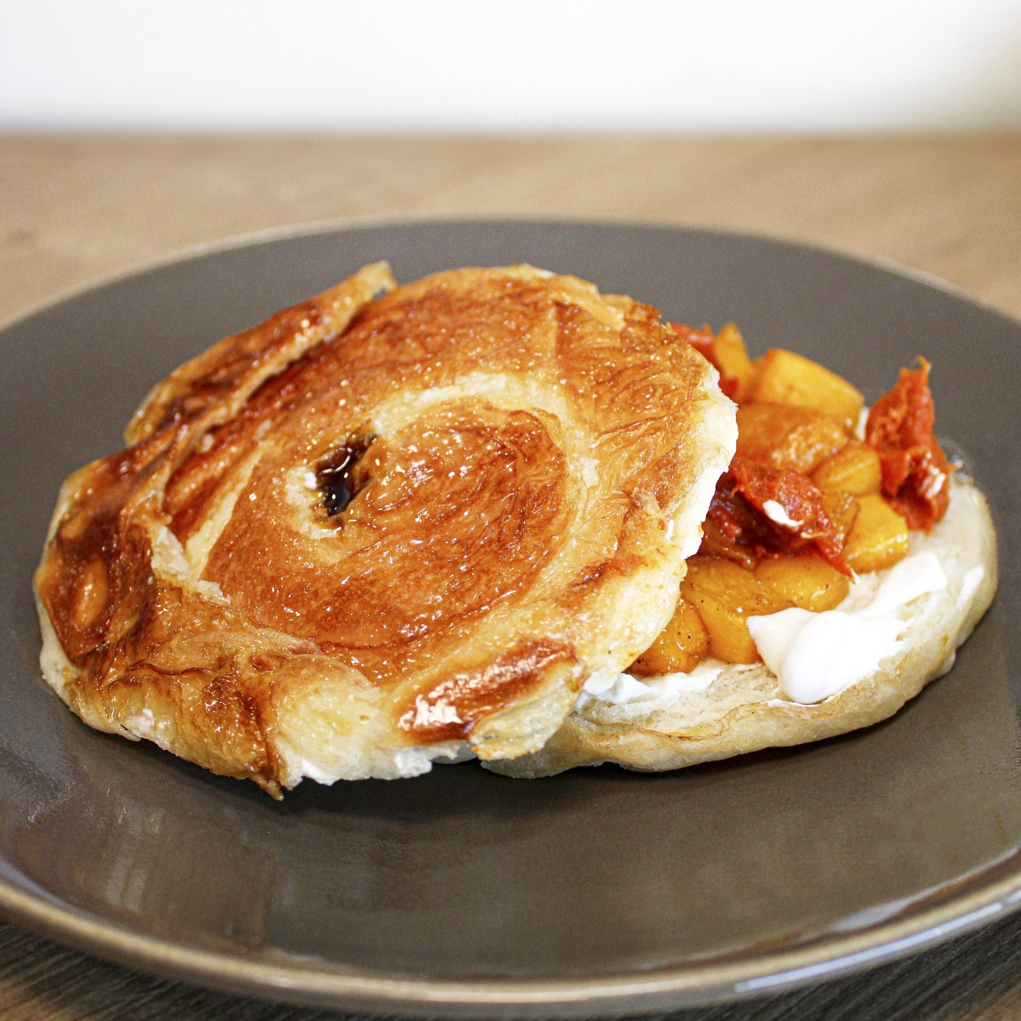 Ensaimada mini cocida de masa aireada, lista para comer. No está decorada, pero es ideal para rellenar al gusto.