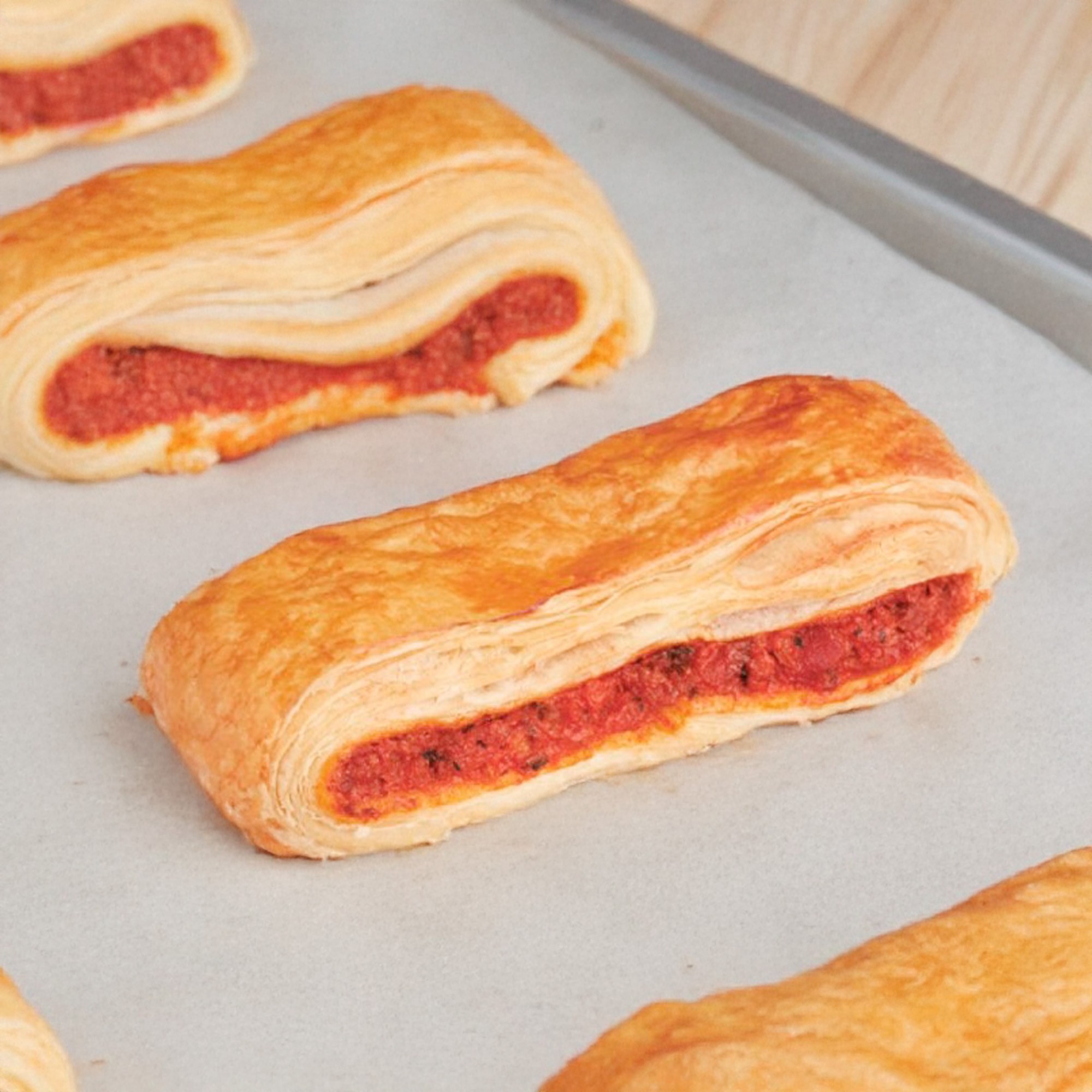 Hojaldre de forma rectangular, con un interior de tomates, calabacines, berenjenas y pimientos, y un exterior crujiente y dorado.