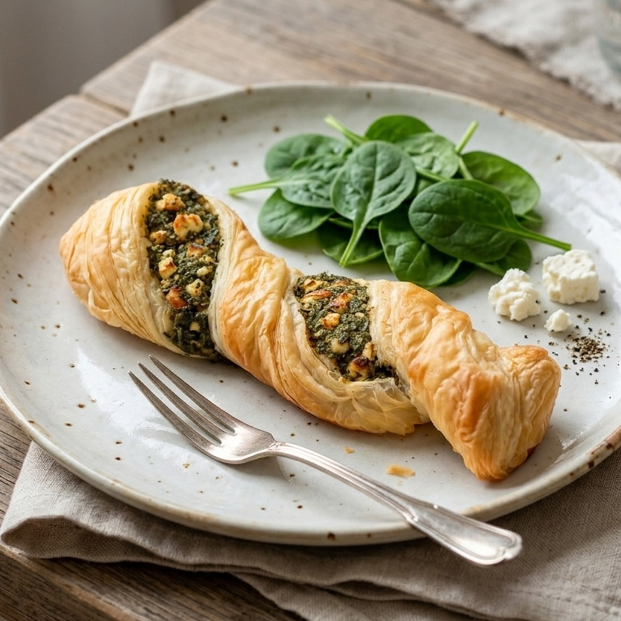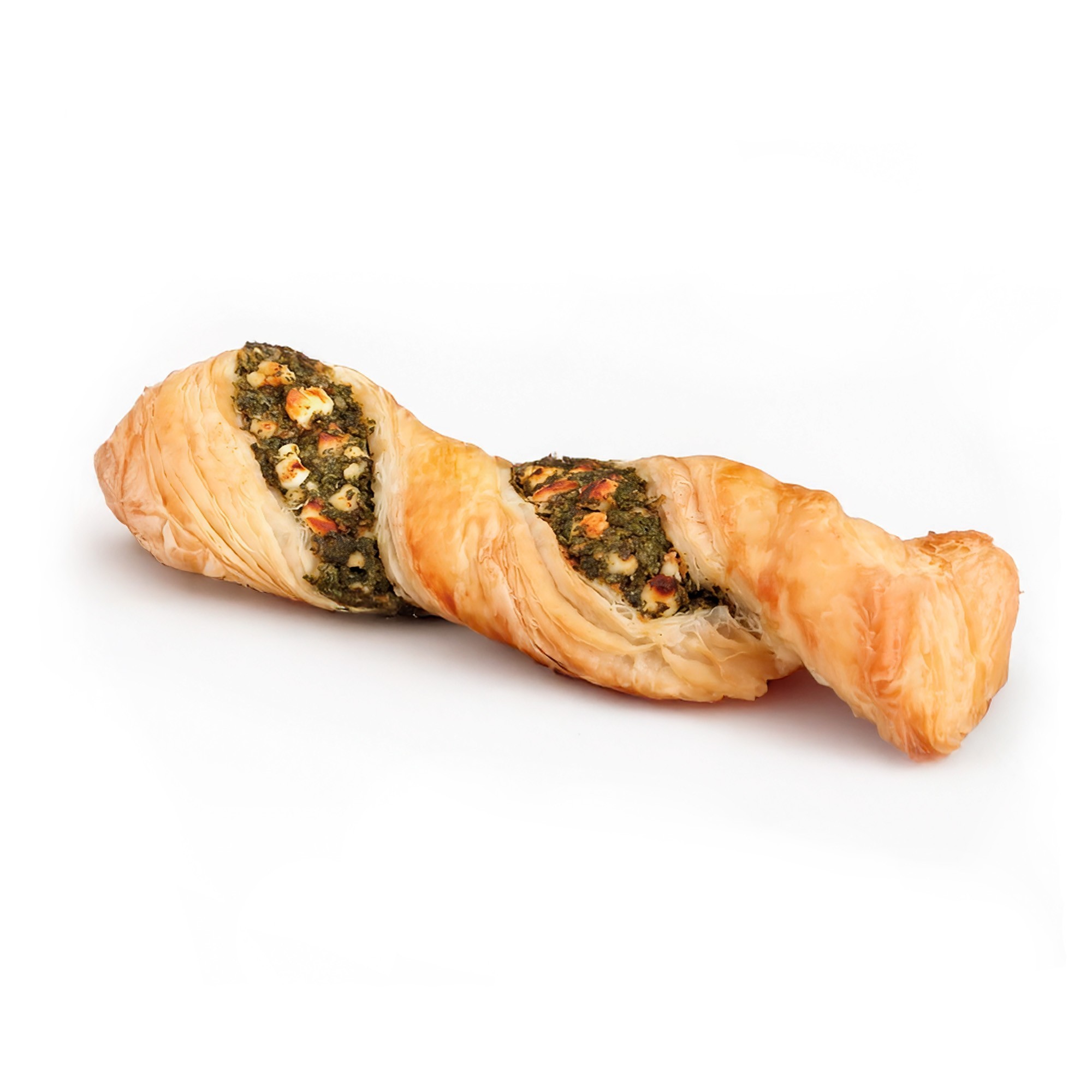Crujiente hojaldre tranzado relleno de queso feta con espinacas. Acabado dorado e ideal para desayunos y meriendas.
