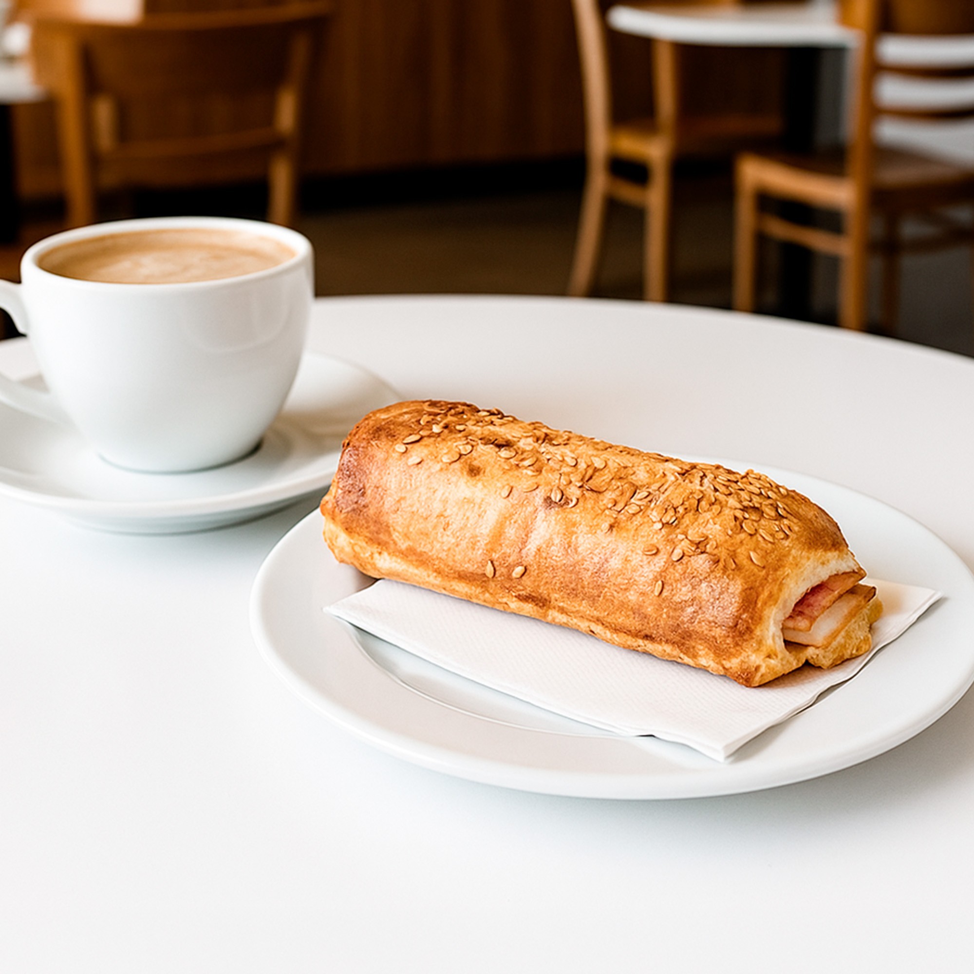 Napolitana rellena de jamón y queso. Forma rectangular, acabado dorado y crujiente. Se recomienda decorar por encima.