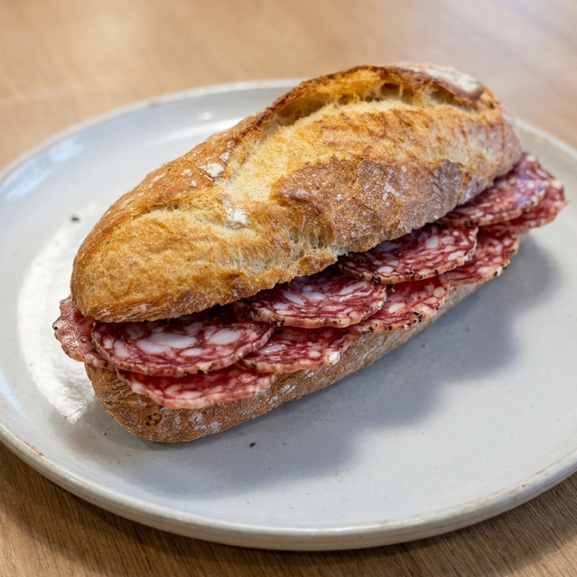 Lonchas de salchichón ibérico con raciones separadas con plástico para mantener su frescura y facilitar su uso. Una ración de 40grs. por bocadillo.