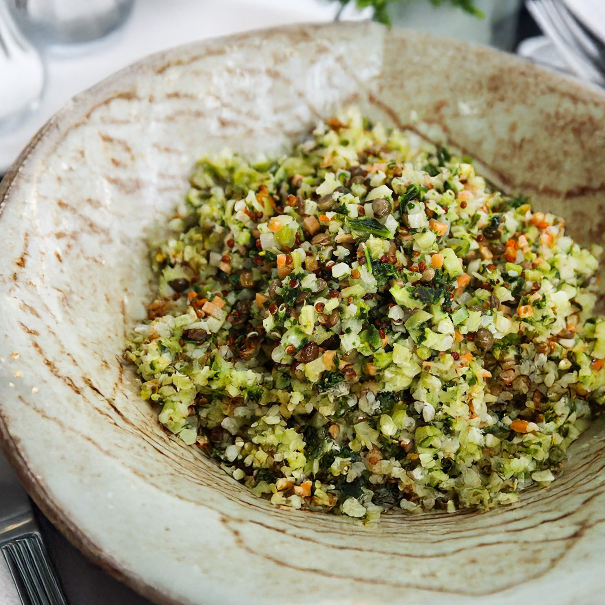 Ensalada elaborada a base de una combinación de verduras cortadas muy finas. Plato sano y equilibrado.