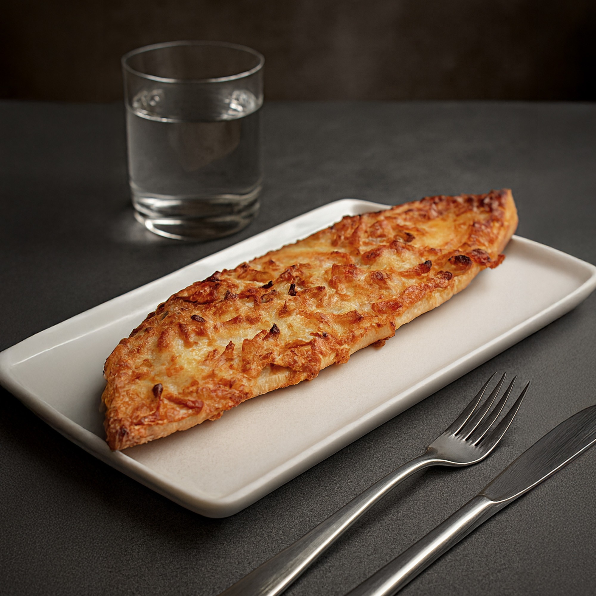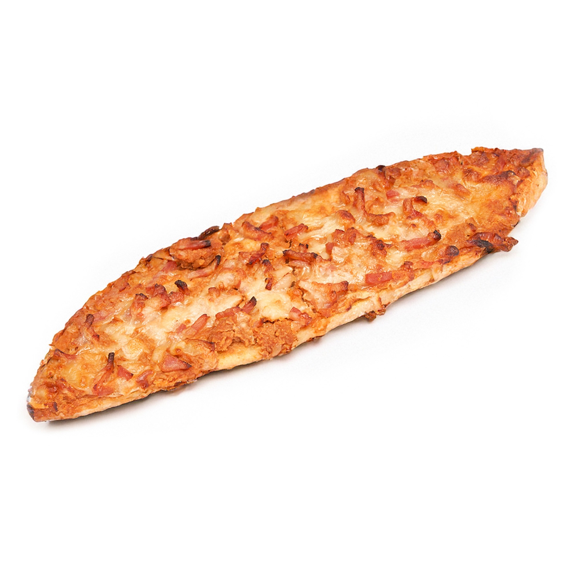 Pan crujiente con una capa de pechuga de pollo con salsa barbacoa y tiras de bacon y queso.