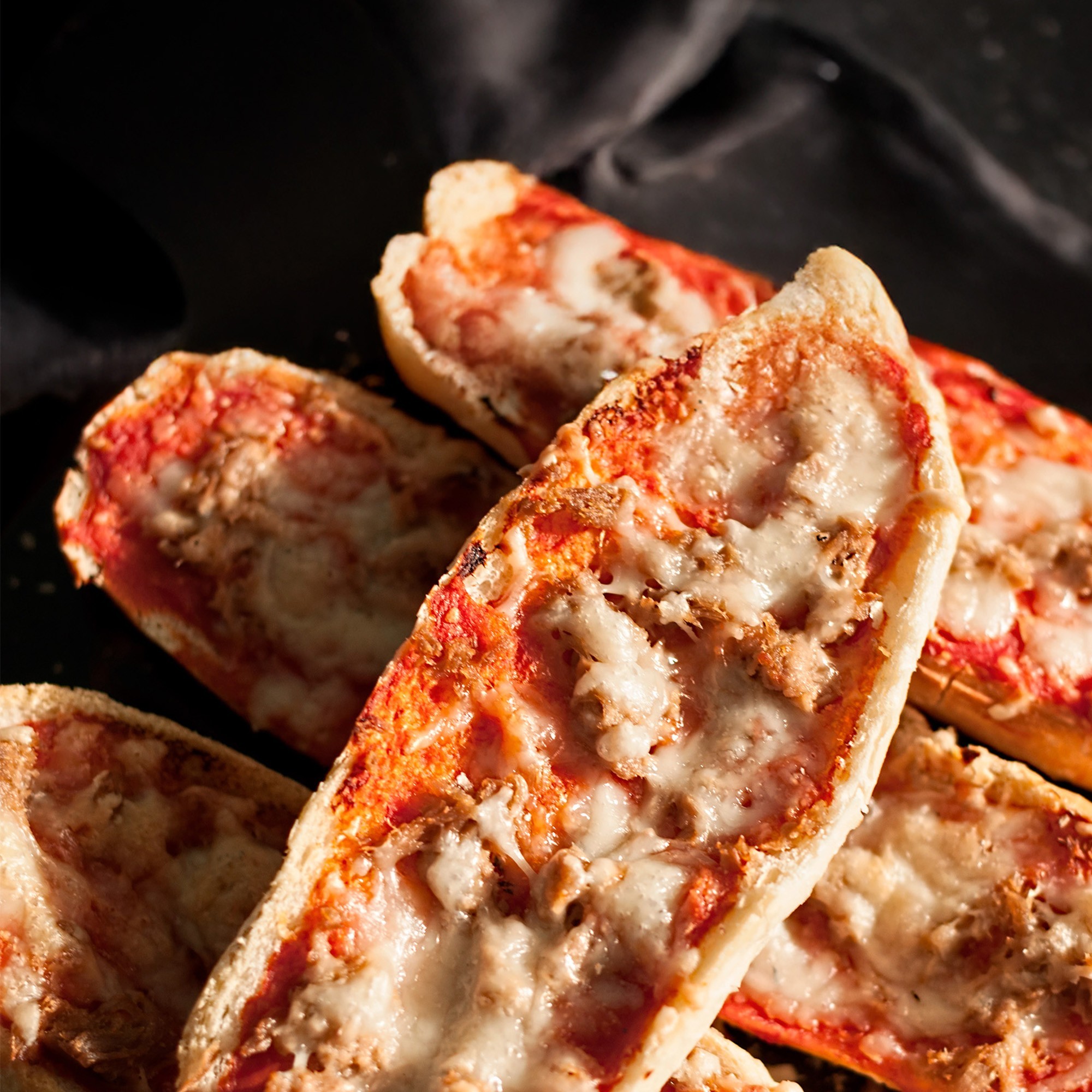 Base de pan crujiente con salsa de tomate y relleno de atún, queso emmental y mozzarella.