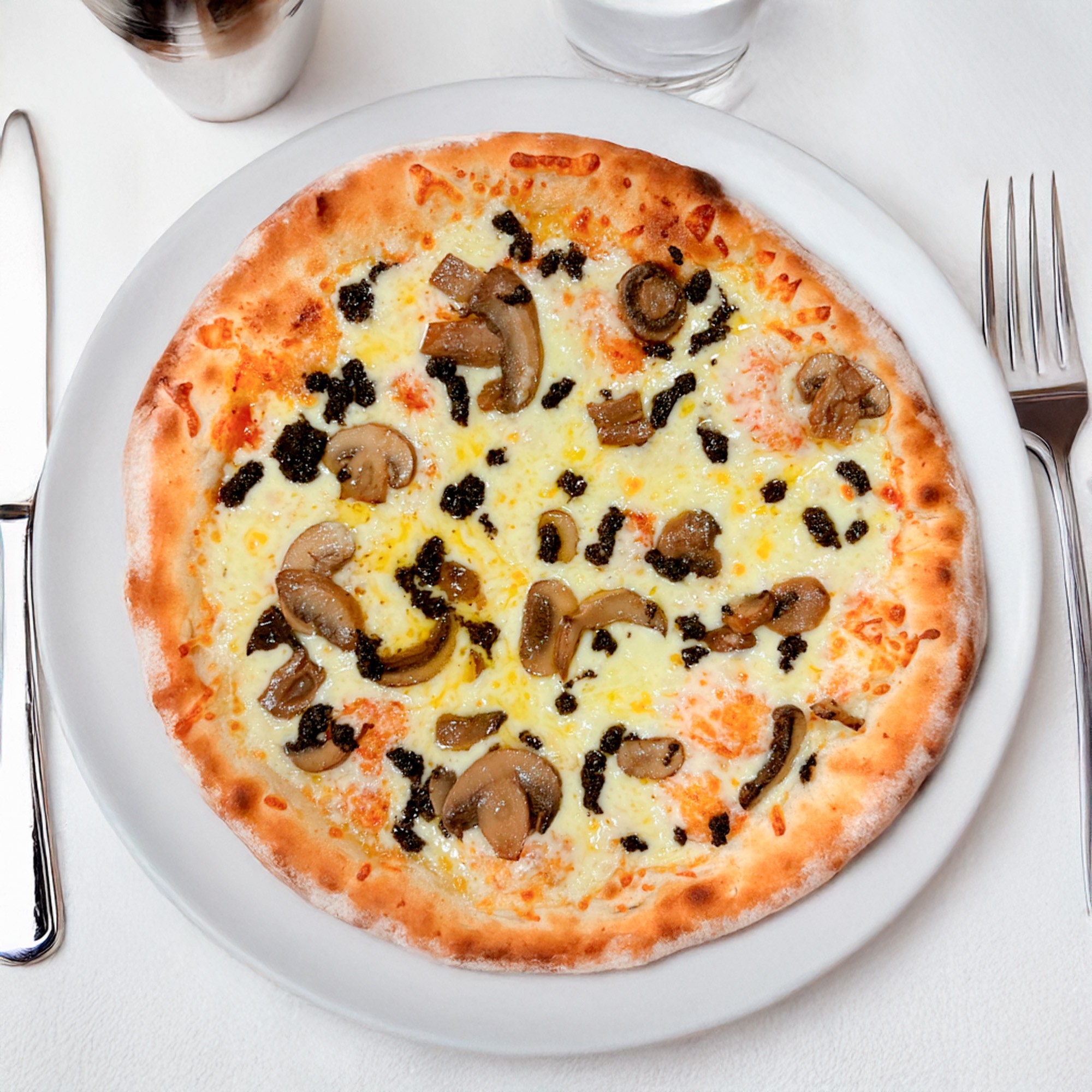 Pizza artesana complementada con champiñones, queso mozzarella y crema de setas con trufa.
