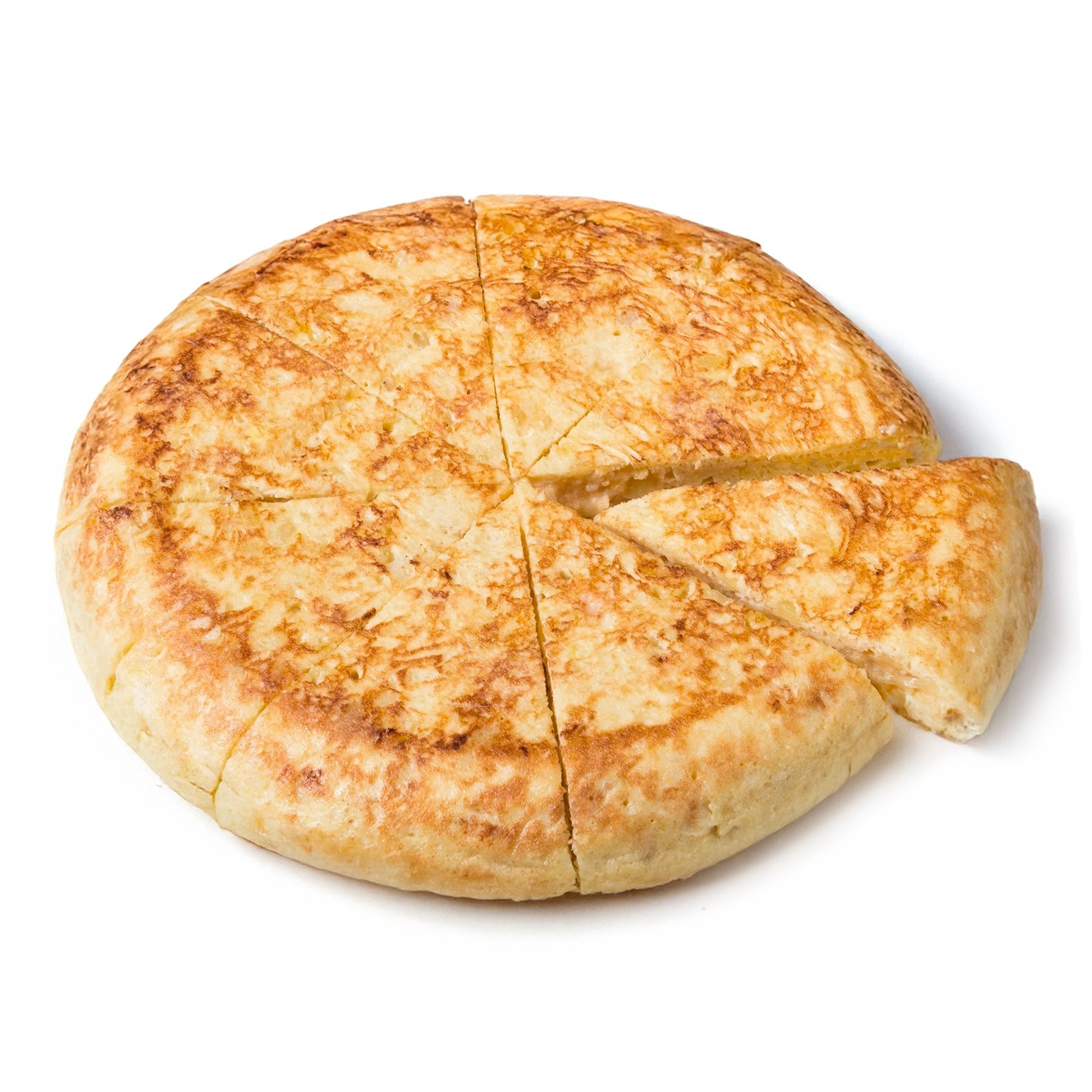 Tortilla redonda de patatas con cebolla, previamente cocida y congelada. Sabrosa e ideal para cáterings.