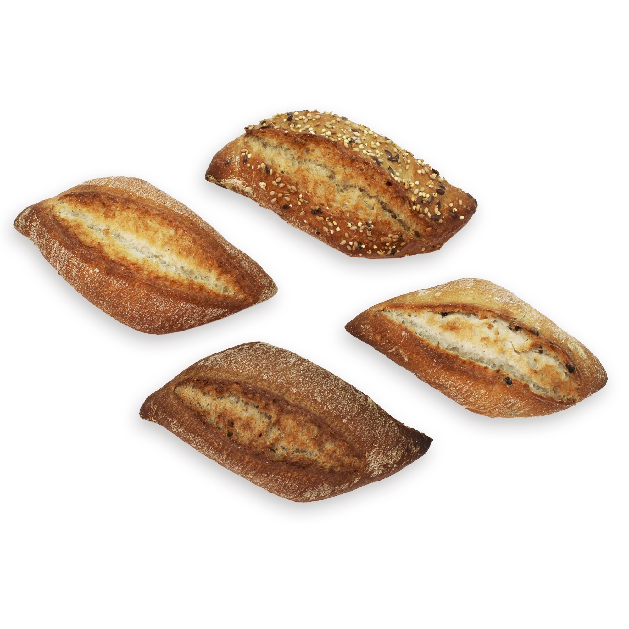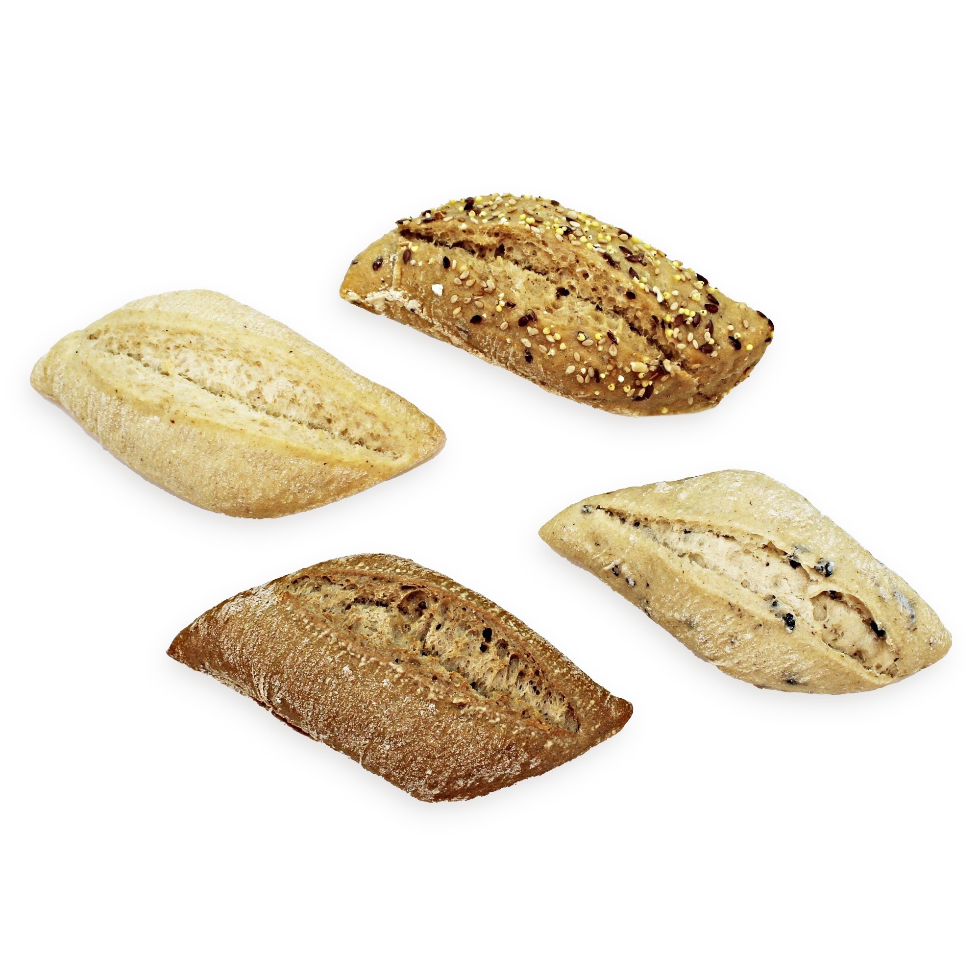 Surtido de 4 mini panecillos, en forma de rombo. Masa Madre, Malta, Cereales y Olivas. Sabrosos y crujientes.